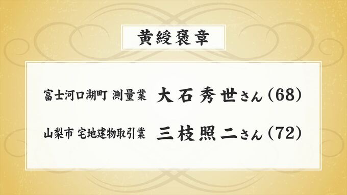受章者のうち、長年にわたってその道一筋に打ち込んできた人に贈られる黄綬褒章は富士河口湖町の測量業 大石秀世さん(68)と、山梨市の宅地建物取引業 三枝照二さん(72)の2人が選ばれました。