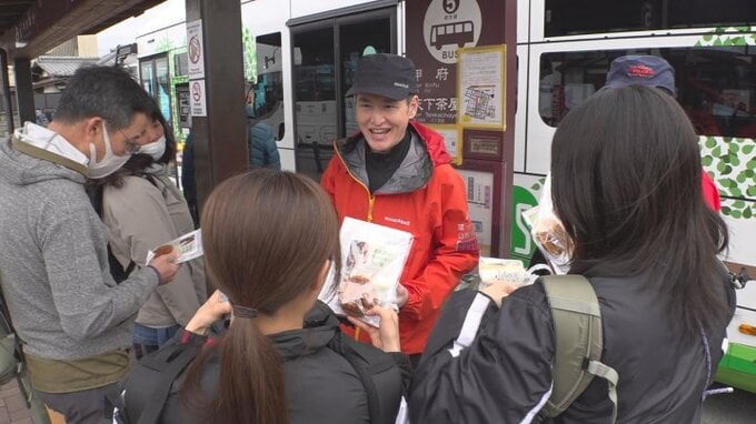 参加者はオリジナルの焼き印が押されたどら焼きとサプリメントを配り、日が暮れる前に下山することや適切な装備を整えるよう呼びかけました。
