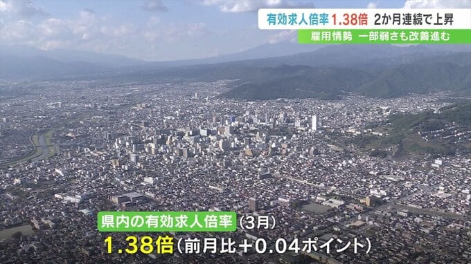 山梨労働局によりますと3月の県内の有効求人倍率は前の月と比べ0.04ポイント上昇し1.38倍となりました。