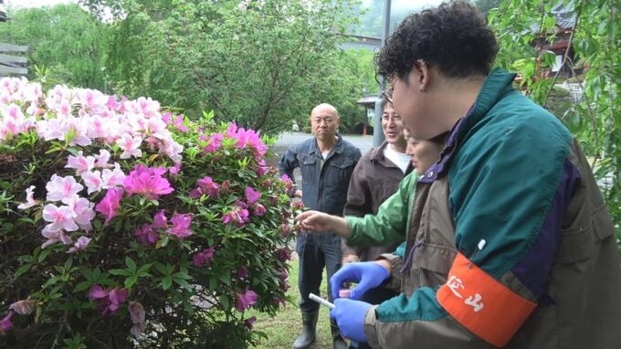 寺の許可をもらって花をとったり、しだれ桜の木の皮をとったり。