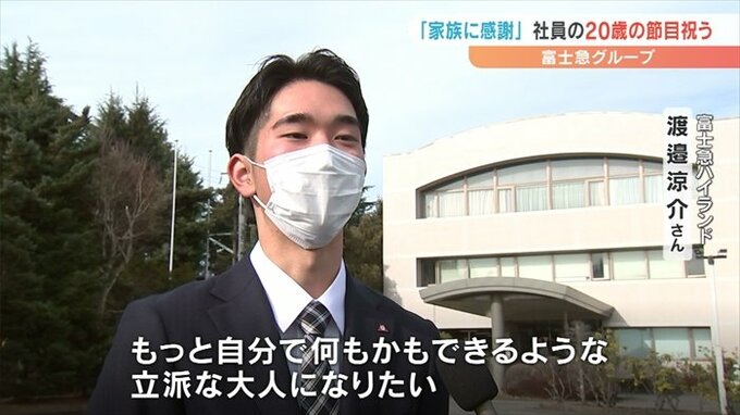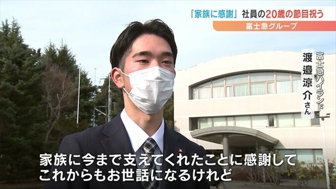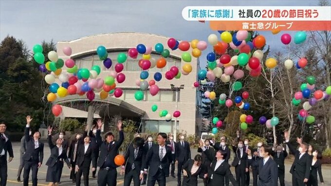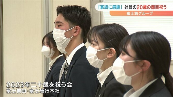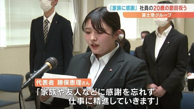 山梨県富士吉田市の富士急行本社で二十歳を迎える社員を祝う会が開かれ、ひと足早く節目を祝いました。