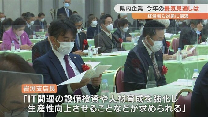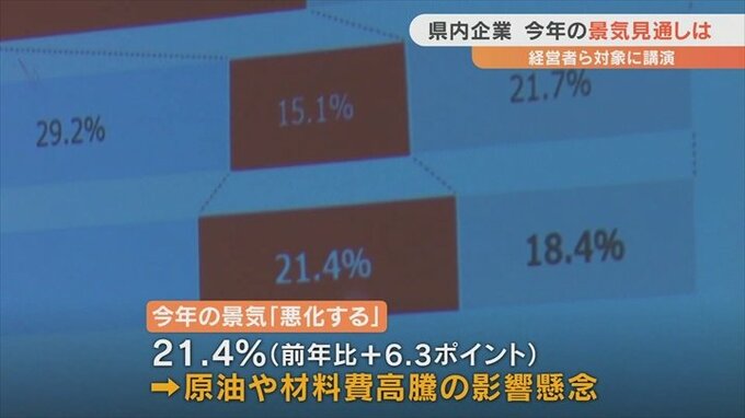 岩渕支店長は県内103社への調査で2023年の景気が悪化すると答えた企業が21.4%と前の年より6.3ポイント増加している現状に触れ、多くの企業が原油や材料費高騰の影響を心配していると指摘しました。