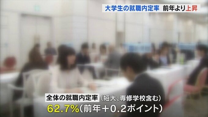 短大や専修学校を含めた全体の就職内定率も62.7%で、こちらも前年より上昇しています。