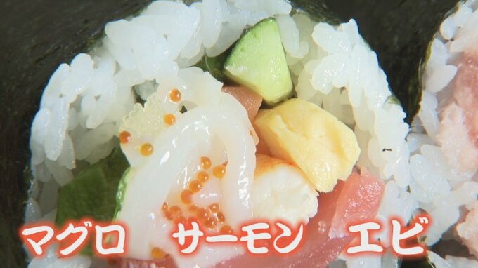 マグロにサーモンにエビ、豪華な海産物がぎっしりと入った太い巻物。