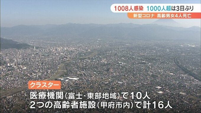 このほか、新たなクラスターは富士・東部地域の医療機関で職員と患者合わせて10人、甲府市内の2つの高齢者施設で合わせて16人の感染が確認されています。