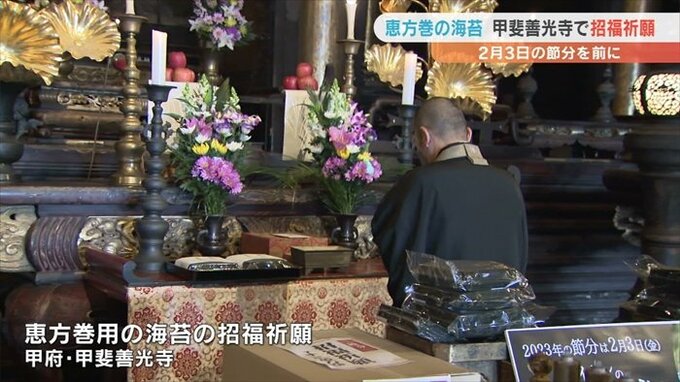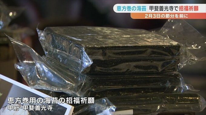 2月3日の節分を前に恵方巻に使う海苔に福を招く招福祈願が、甲府市の甲斐善光寺で行われました。