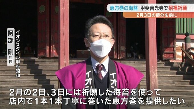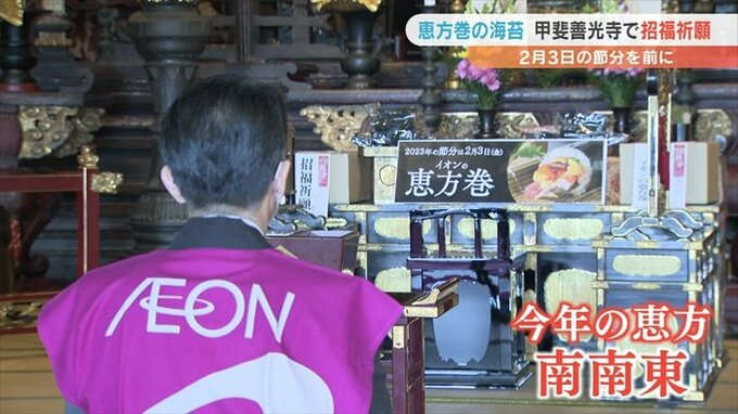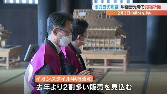 甲斐善光寺で祈願を行うのはコロナ禍の影響で3年ぶりのことで、本堂には恵方巻に使われる焼き海苔2500枚が供えられ、読経の中で店長らが恵方巻購入者の無病息災や招福を祈りました。
