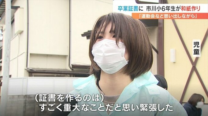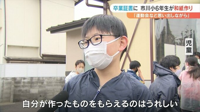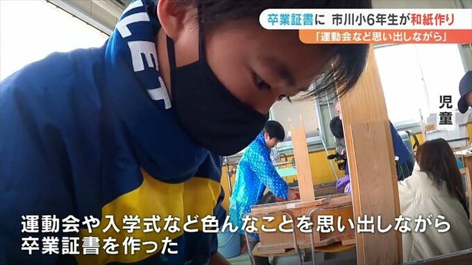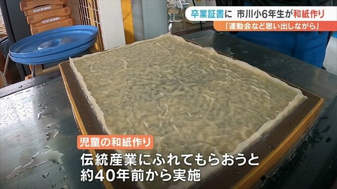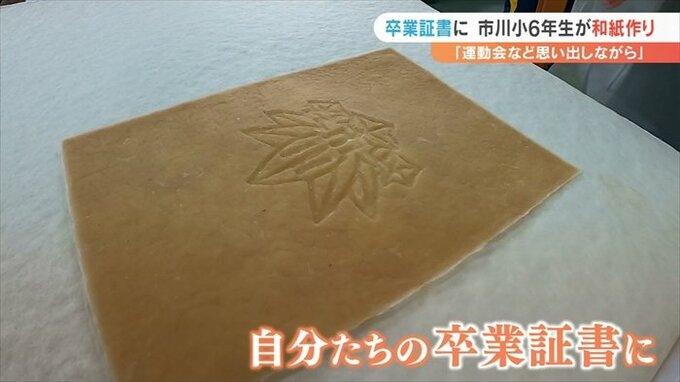 地元の伝統産業の和紙に触れてもらおうと、市川小で40年ほど前から始まった取り組みで、完成した和紙は自分たちの卒業証書になります。