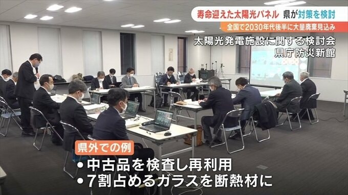 1月27日に開かれた県の検討会には県外の業者が招かれ、中古品の性能を検査し再利用する取り組みや、素材の7割を占めるガラスを断熱材などにリサイクルする取り組みなどが紹介されました。