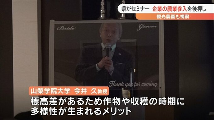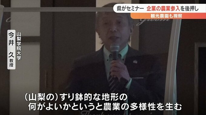 まず山梨学院大学の今井久教授が、山梨は標高差があるため栽培する作物や収穫の時期に多様性が生まれるといったメリットを説明しました。