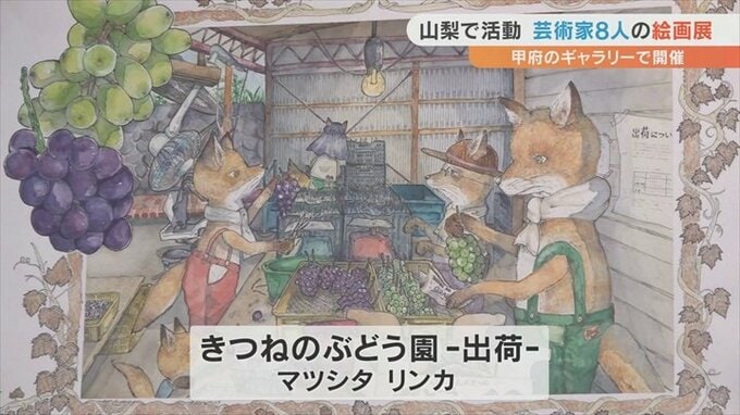マツシタさんがキツネの家族を描こうと考えた時に実家のブドウの出荷作業が浮かんだという山梨らしい作品です。