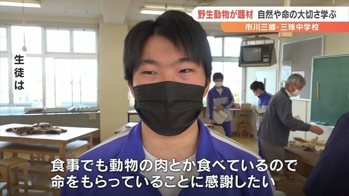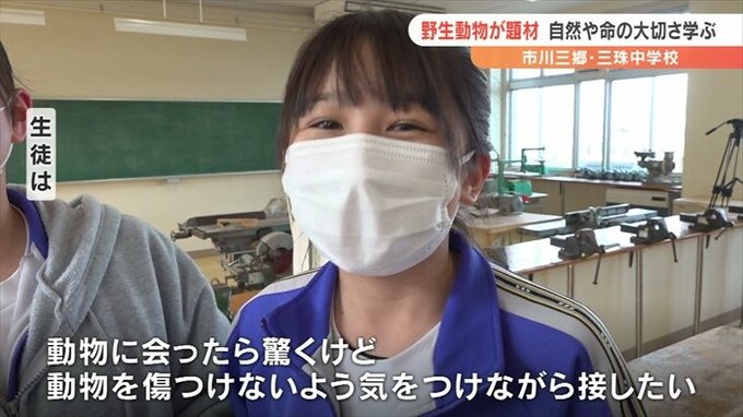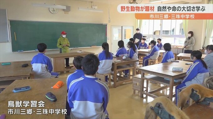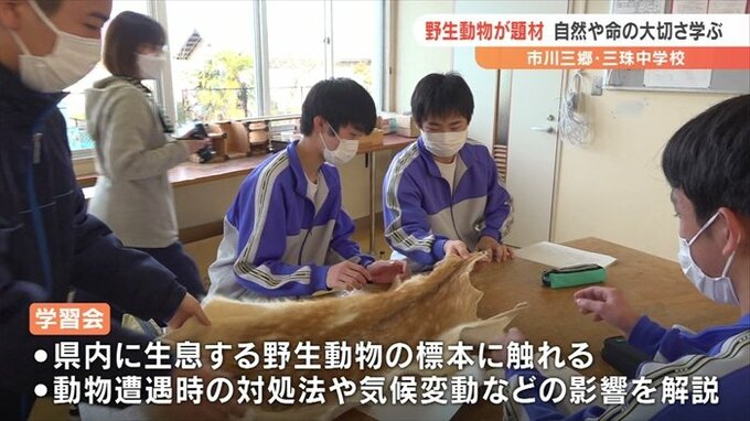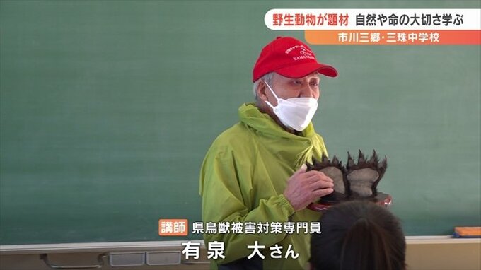 シカやクマなど山梨県内に生息する野生動物を題材に、自然や命の大切さを学ぶ学習会が山梨県市川三郷町の中学校で開かれました。
