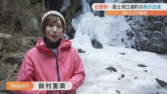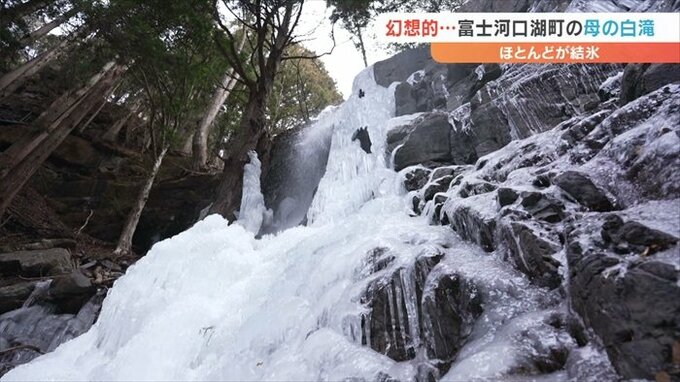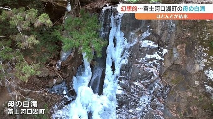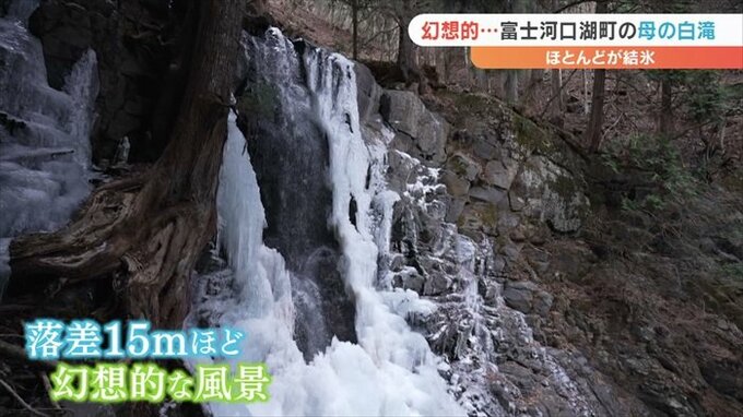 1月下旬からの厳しい冷え込みで、落差15mほどの滝がほとんど凍り、幻想的な風景に。