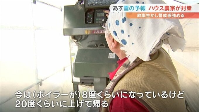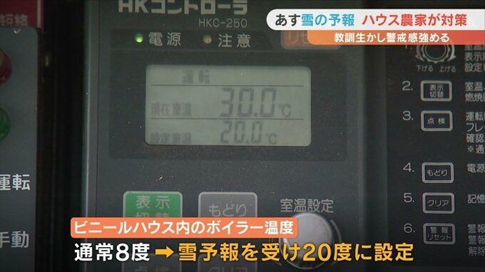 こちらでは10日の雪の予報を受けハウス内を温めるボイラーの温度を通常の8℃から大幅に上げた20℃に設定しました。