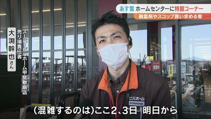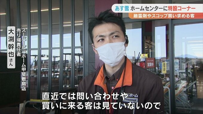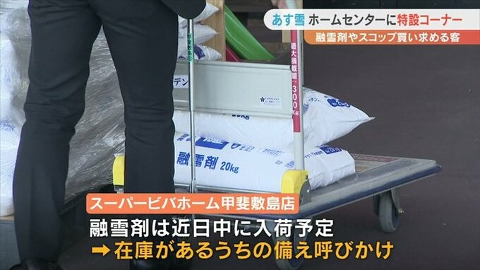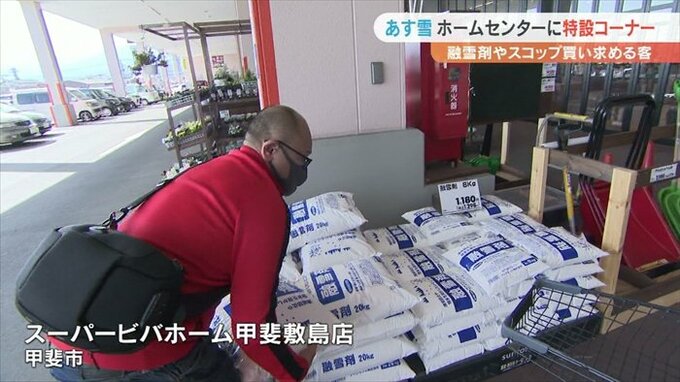 甲斐市にあるスーパービバホーム甲斐敷島店には雪対策の特設コーナーが設けられ、10日の雪に備えようと融雪剤やスコップを買い求める客が訪れていました。