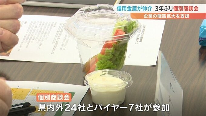 3年ぶりの開催となった今回は中部横断道の開通に伴って結んだ連携協定により、長野や静岡の信用金庫の取引先が初めて参加し、食品製造会社など山梨県内外24社の担当者がスーパーなど7社のバイヤーと個別商談に臨みました。