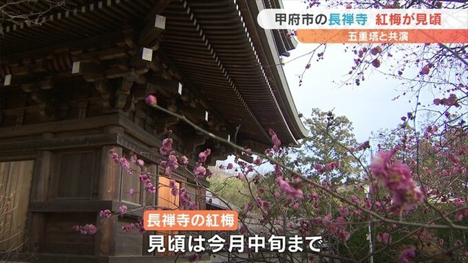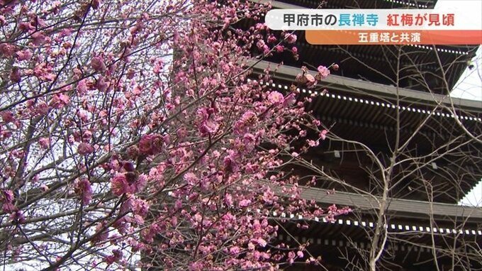甲府市の長禅寺の紅梅は2月中旬までが見頃です。