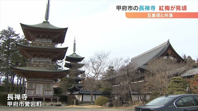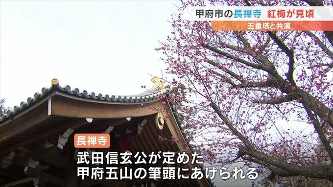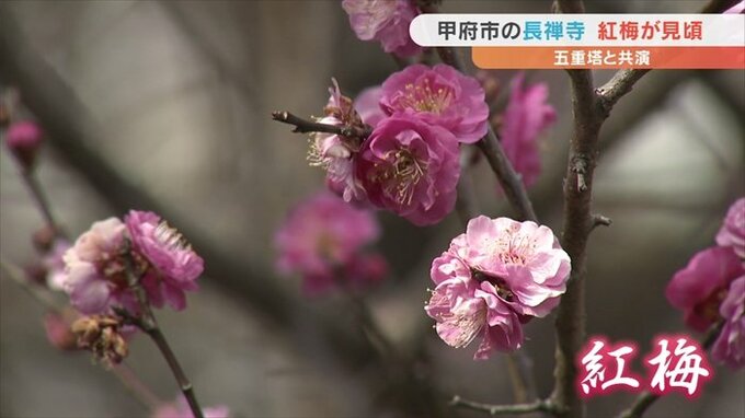 武田信玄公とゆかりの深い甲府市の寺で紅梅の花が見頃を迎えています。
