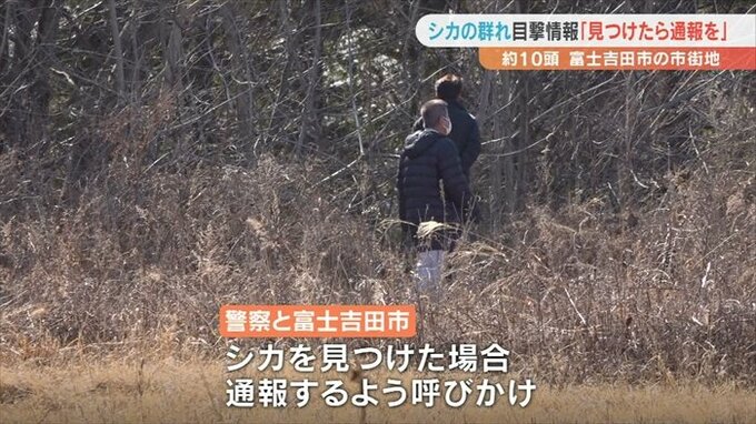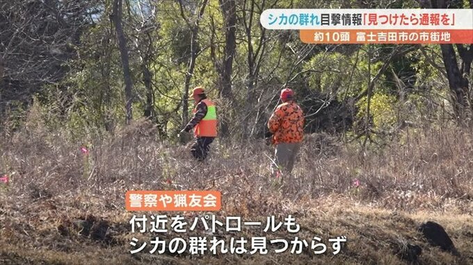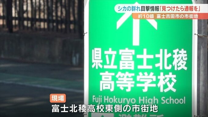 群れが目撃された現場は県立富士北稜高校の東側の市街地で、警察や地元の猟友会が付近をパトロールしましたが、その後、シカの群れは見つかりませんでした。