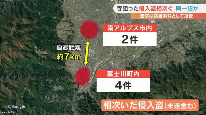 山梨県の南アルプス市と富士川町で寺を狙い、建物内に侵入する事件が相次いでいることがわかりました。