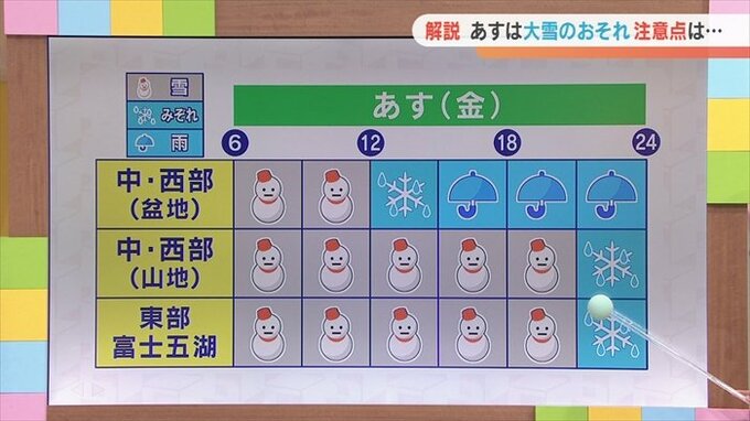 では、どの時間帯が雪か雨かというのを詳しく見ていくと、まず、中・西部の山地、さらに東部・富士五湖は基本的に気温が低い状況が続きますので、夜のはじめ頃、午後9時頃にかけて雪でずっと続く見込みです。その後、みぞれへと変わる予想。