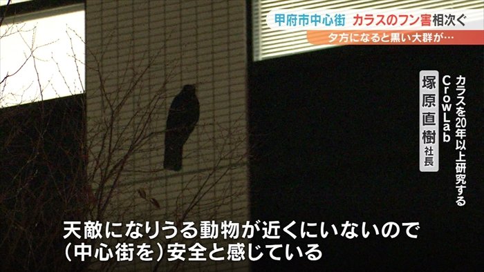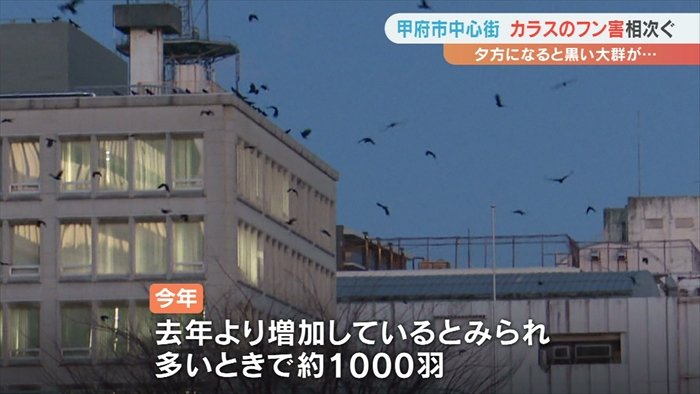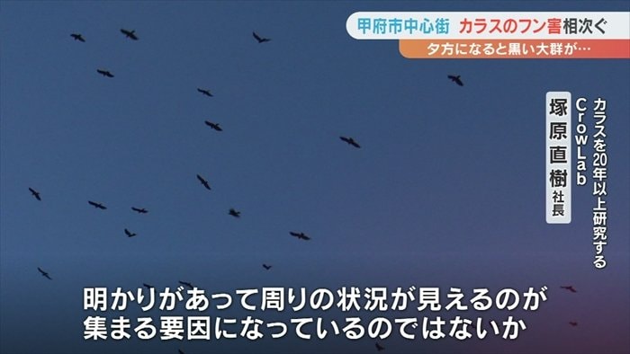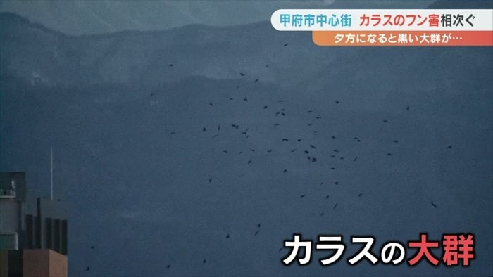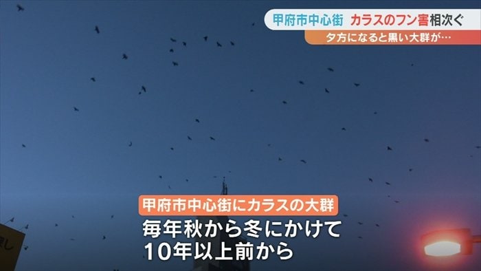 甲府市の中心街にカラスの大群が現れるのは毎年秋から冬にかけてで、10年以上前からです。