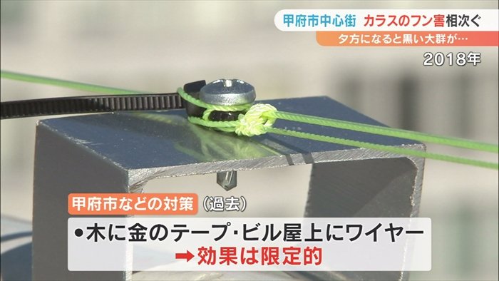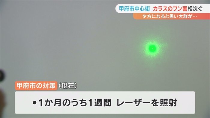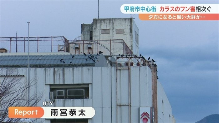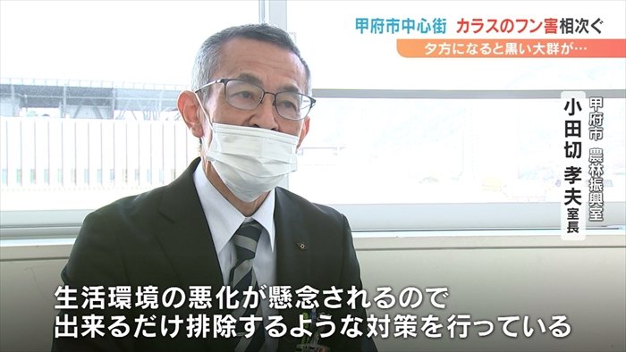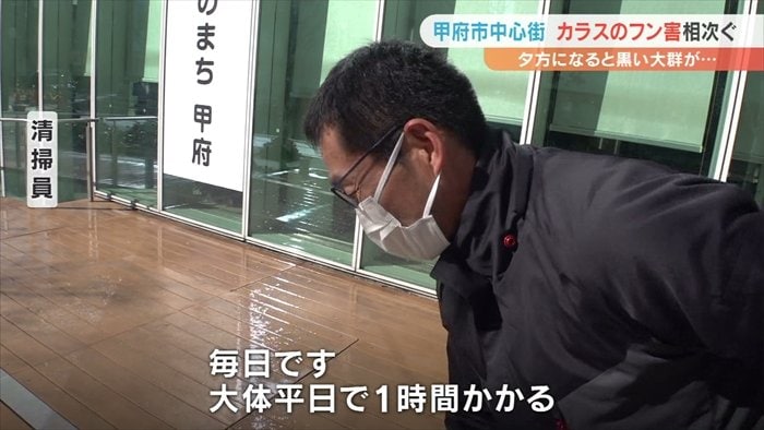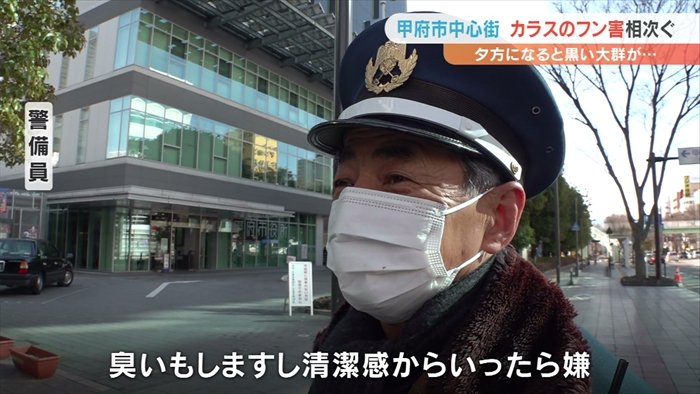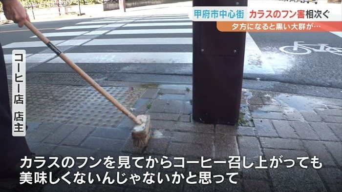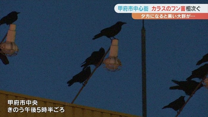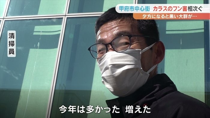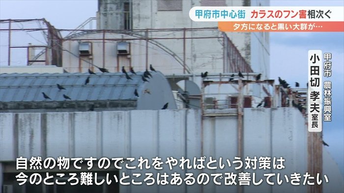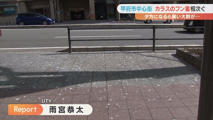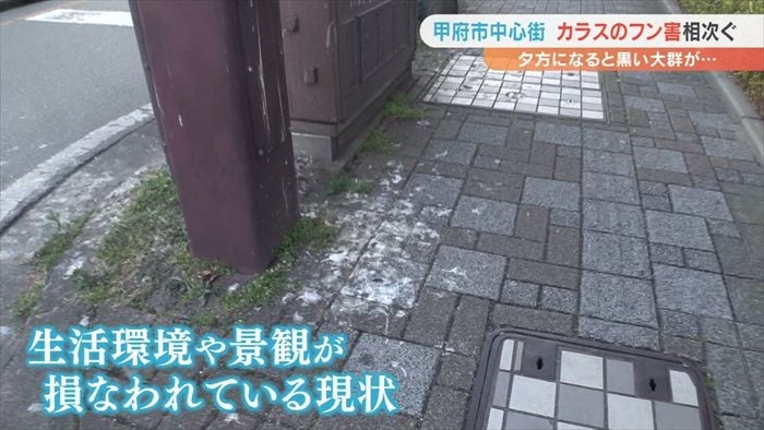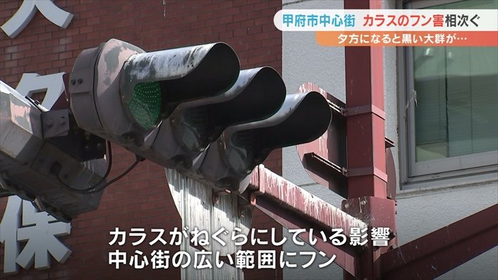 甲府市の中心街でカラスのフンなどの被害が相次いでいる問題です。