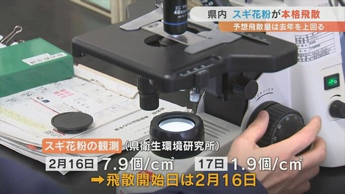 県衛生環境研究所は2月16日に7.9個、翌17日に1.9個の花粉を観測したため、2月16日が飛散の開始日と発表しました。