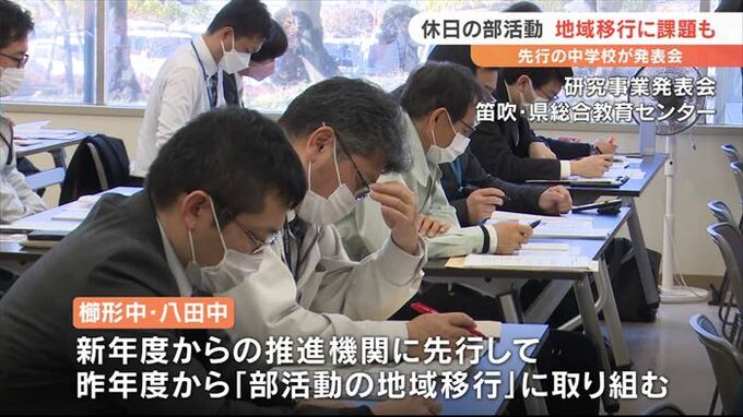 来年度からの「改革推進期間」を前に県内では、南アルプス市の櫛形中学校と八田中学校がモデル校となり、昨年度から「地域移行」に取り組んでいて、22日は市町村の担当者を前にその成果と課題を発表しました。