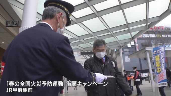 「春の全国火災予防運動」が3月1日に始まり、JR甲府駅前では防火を呼びかける街頭キャンペーンが行われました。