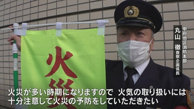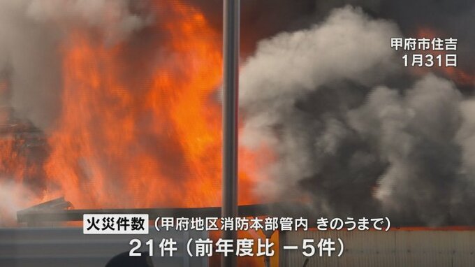 甲府地区消防本部管内で、今年に入って2月28日までに起きた火事は21件で去年の同じ時期に比べて5件減っていますが、1年のうちでは春先までの時期に火災が発生しやすく注意が必要ということです。