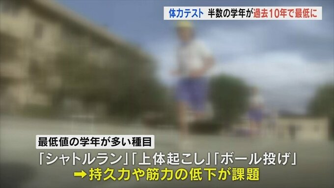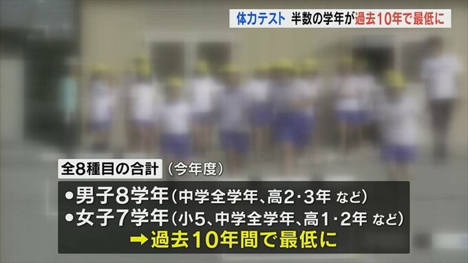今年度の結果「50メートル走」や「握力」など全8種目の合計が男子は8つの学年、女子は7つの学年で過去10年間で最も低くなり、中学生は全ての学年で最低値でした。