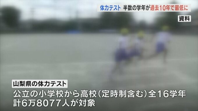 小学生から高校生までを対象にした山梨県の体力テストの結果、半数の学年で過去10年間で最も低くなったことがわかりました。