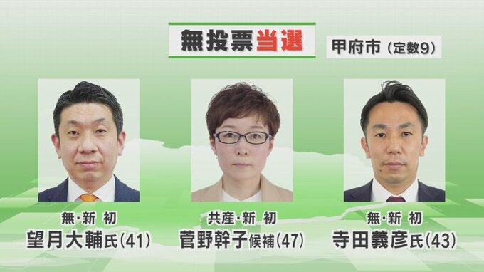 新人は3人が当選しました。無所属の望月大輔さん、共産党の菅野幹子さん、無所属の寺田義彦さんが初当選です。