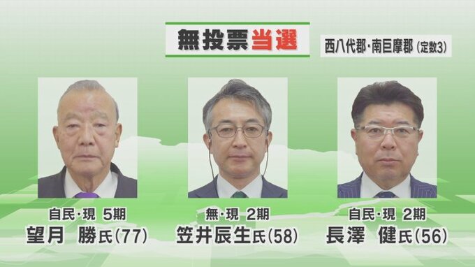 自民党の望月勝さんが5期目の当選。無所属の笠井辰生さんと自民党の長澤健さんが再選を果たしました。