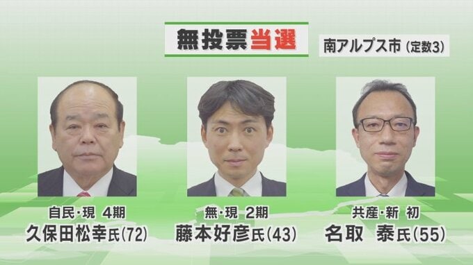 自民党の久保田松幸さんが4期目の当選、無所属の藤本好彦さんが2期目の当選です。共産党の新人 名取泰さんが初当選を果たしています。