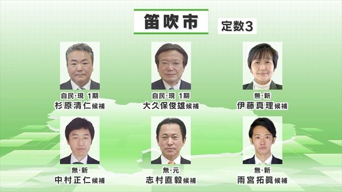 杉原さんと雨宮さん、中村さんの3人はそれぞれ長崎知事に近い立場と言えます。一方、大久保さんは知事と距離をとる会派に所属し、志村さんは自民党を離党し知事選で長崎知事と戦いました。自民党支持層で激しい票の奪い合いなるとみられます。新人の伊藤さんは非自民の票を固める事がカギとなりそうです。