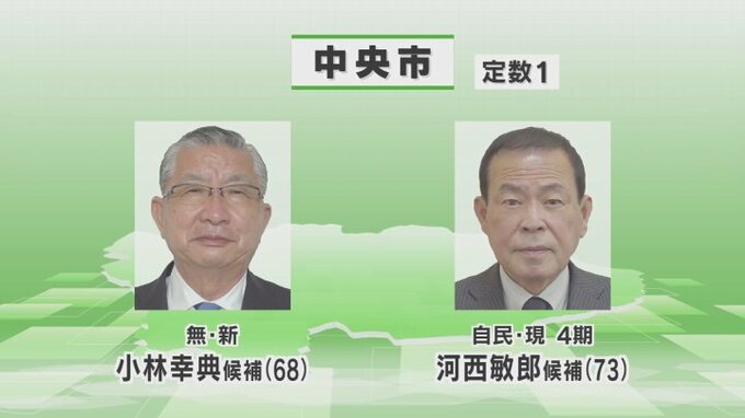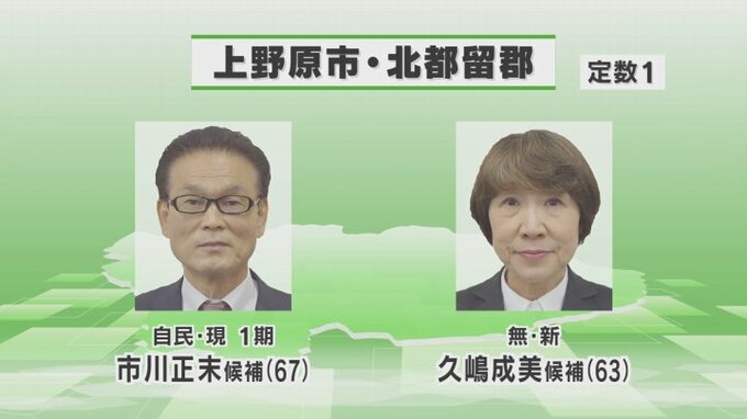 定数1に対し、自民党の現職 市川正末さんと無所属の新人 久嶋成美さんの一騎打ちとなっています。