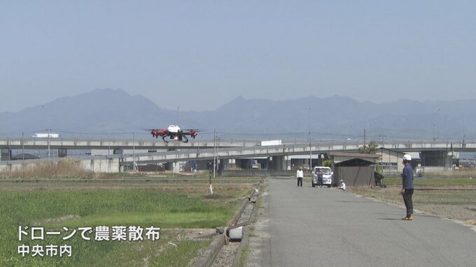 自動運転のドローンを使って農薬を散布する実演会が、山梨県中央市で行われました。先端技術を活用したスマート農業の取り組みです。