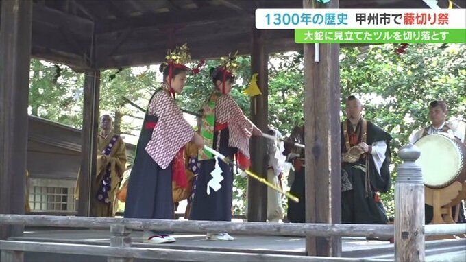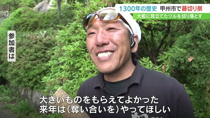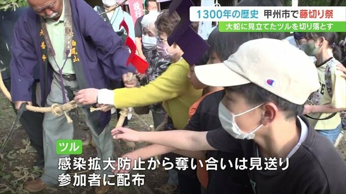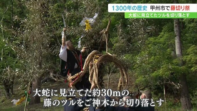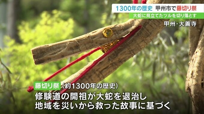 大蛇に見立てた藤のツルを切り落とす伝統の「藤切り祭」が山梨県甲州市の大善寺で行われました。