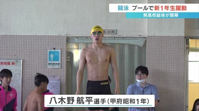 また男子200m平泳ぎでは山梨学院の1年生大森理央選手が、県高校記録にわずか100分の1秒差の2分13秒40の大会新記録で優勝しました。