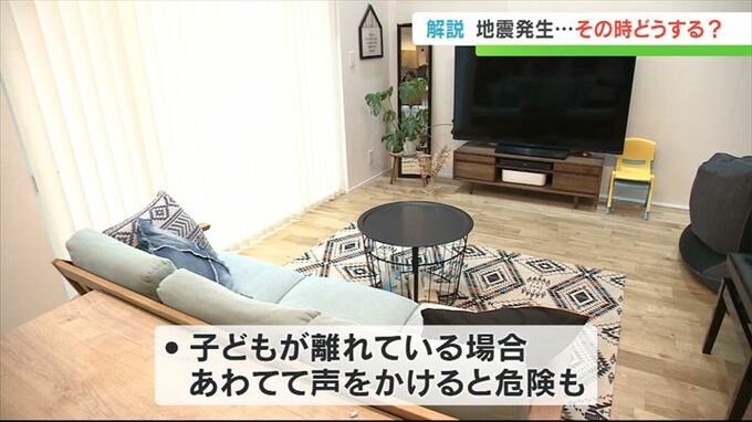 揺れている最中にお子さんの方へ向かうのは危険ですし、お子さんが親の方へ来るのも危ないので、お風呂やトイレ、子どもの部屋、リビングなど様々な所でそこにいたらどうなるのか、どう身を守ったら良いのか、日頃から考えて、その場で身を守ることも重要です。