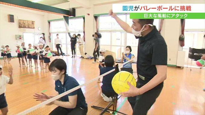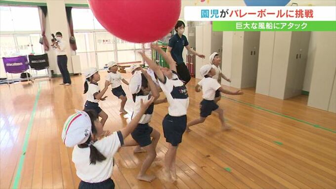 園児たちは巨大な風船を落とさないゲームでバレーの動きを体験し、ホールを夢中で動き回りました。
