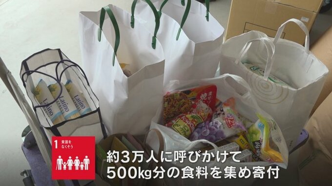 寄付したのは160kg分のコメと缶詰や菓子、カップ麺など340kgの食料のあわせて約500kgです。