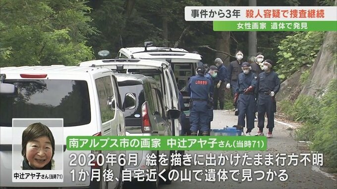 南アルプス市の画家中辻アヤ子さん(当時71)は3年前の6月2日、絵をかきに出かけたまま行方不明となり、1か月後、自宅近くの山で遺体で見つかりました。