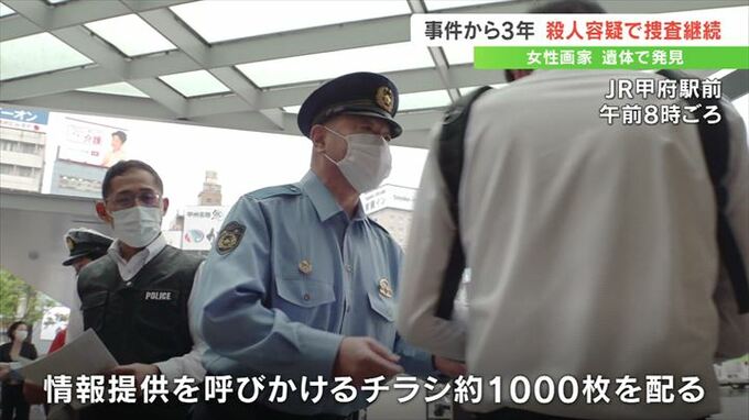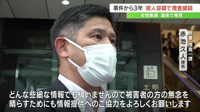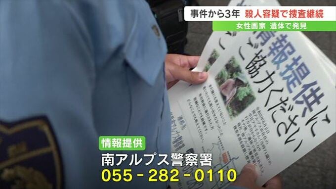 山梨県南アルプス市の画家の女性が行方不明になり、その後、遺体で発見された事件から6月2日で3年です。県警は、容疑を殺人に切り替えて捜査を続け改めて情報の提供を呼びかけました。