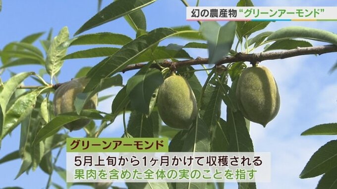 一方で、グリーンアーモンドは、実がなり始める5月上旬から1ヶ月かけて収穫されるもので、果肉を含めた全体の実のことを指します。