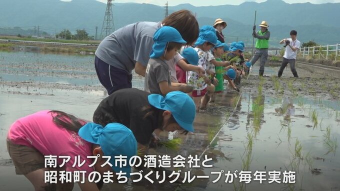 この活動は南アルプス市の酒造会社と昭和町のまちづくりグループが毎年行っているもので、8日は日本酒の原料となる酒米「山田錦」の苗を田んぼに植えました。