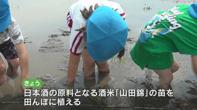 日本酒に使う酒米を育てようと山梨県昭和町で保育園児が田植えに挑戦しました。