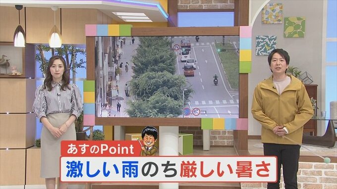 明日のポイントは「激しい雨のち厳しい暑さ」です。